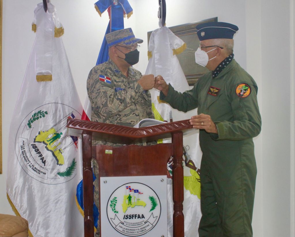 Santo Domingo, RD., El Director General del Instituto de Seguridad Social de las Fuerzas Armadas, General de Brigada Piloto, William W. Sharp Jiménez, FARD recibió al Director General de la Industria Militar De Las Fuerzas Armadas, Gral. De Brigada Piloto, Enmanuel M. Souffront Tamayo, FARD, haciendo entrega de la Moneda y Pin oficial del ISSFFAA, aprovechando la ocasión para tratar temas de interés para el beneficio del soldado dominicano.